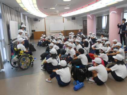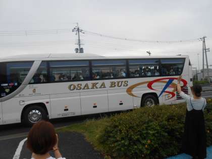 小雨降る中、6年生全員が、ランチルームで出発式を行ったあと、バスに乗り込みます。6年生たちはたくさんの方のお見送りに手を振り、いよいよ広島へ出発です!