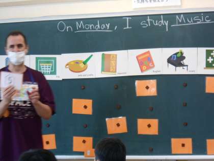 曜日の言い方と、教科の言い方を学習しました。その後、班ごとにポイントを集めるゲームをして、盛り上がりました。カードの裏にポイントが書かれていて、大きいポイントだったときは、大盛り上がりの4年生たちでした♪