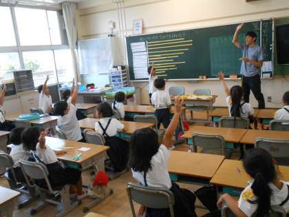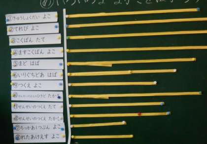 算数の時間に、ものさしの学習をまだしていない1年生は、テープの長さを見比べて、どれが長いかを比べる学習をしていました。教室内のいろいろな長さを測り、実際に比べていきました!楽しそうに学習できています♪