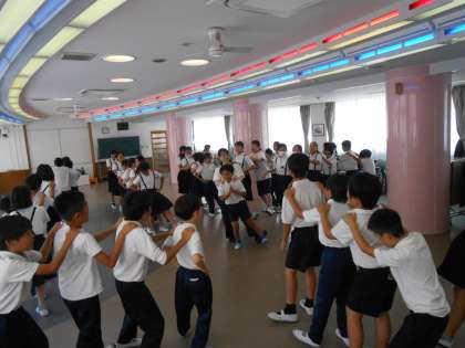 林間の出し物の練習中です。ジェンガをみんなで踊りました。「前、後ろ、前、前、前!」と声をそろえて大盛り上がりの5年生たちでした!