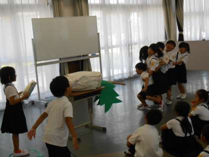 大きなかぶの朗読劇がランチルームで行われました。1グループずつ披露して、1グループずついいところを伝え合っていました。最後まで集中して、楽しんで見ることができていました!