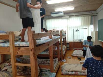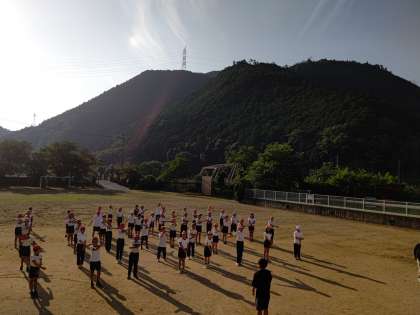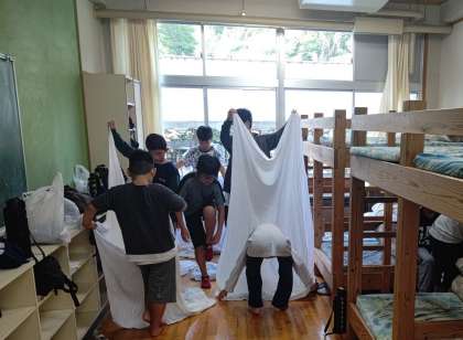 林間2日目開始です 公開日 2023/07/27 更新日 2023/07/27 5年 おはようございます。吉野宮滝野外学校に来ている5年生たちの朝が始まりました。 シーツの畳み方に苦戦しながら友だちの分も手伝い終え、朝の集いでラジオ体操をしました。