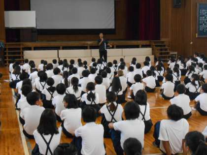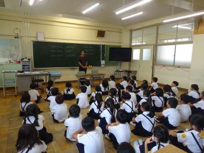 中:1年生は学年で集まって話をしていました。2学期は運動会や遠足など大きなイベントがたくさんあります。「どんな運動会にしたい?」「どんな遠足にしたい?」と聞くと「たのしい運動会にしたい!」「お家の人が感動する運動会にしたい!」「楽しい遠足にしたい!」とたくさん声があがりました。「そのために何をがんばる?」と聞くとみんな真剣に考えていました。たくさん考えて伝え合える2学期にしてほしいです!