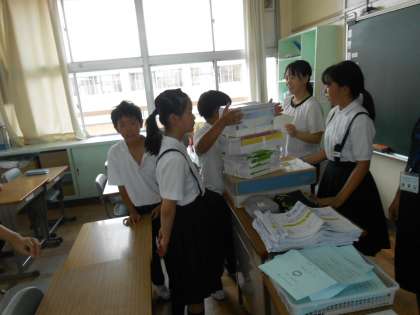 下:5年生の新しい教科書を教室に持って上がって、一息ついている様子です。