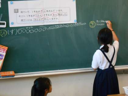 自分の考えを一人で考えて表現できたら、交流タイムです。2年生もペアで自分の意見を言い合うことを大事にしていました。黒板に考えを書いて発表もできていました。2年生、どんどん交流の力が付いていきます!!
