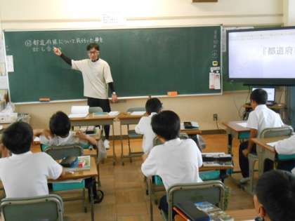 上:4年生は、都道府県の地図の学習の導入をしました。地図を見て気づいたことをノートにたくさん書き、交流を進めました。