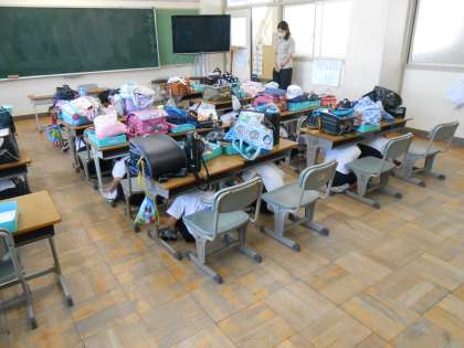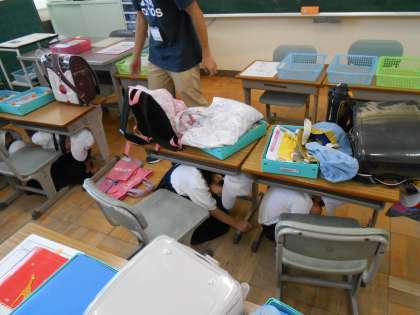 「880万人訓練」として、どのクラスでも放送の合図で机の下に入り、頭を守る訓練をしました。1年生も、真剣に訓練に取り組めました。