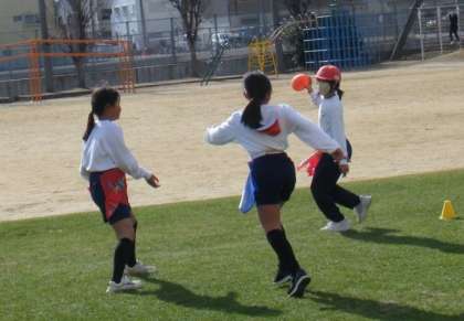 ラグビーと同じく、「前にボールを投げてはいけない」というルールで、2対1の練習を繰り返しています。ディフェンスも必死にオフェンスの人の腰のフラッグを取りに行きます。ワールドカップ並みの熱い攻防が至る所で行われていました♪