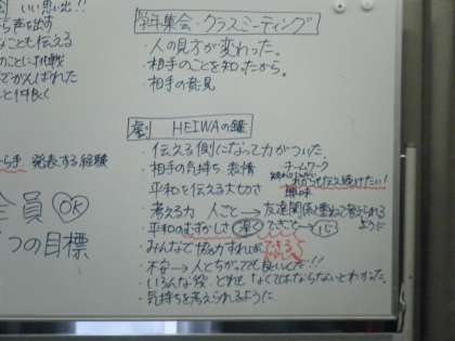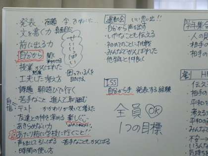 6年生 一人ひとりの成長 公開日 2023/12/22 更新日 2023/12/22 6年 学年ミーティングで、自分の成長を一人ひとりが語っていきました。代表委員の人が前に立ち、司会を進めました。子どもたちの発表のキーワードをまとめていくと、ホワイトボードがいっぱいになりました。6年生集団が、3学期により飛躍するであろうことが伝わるミーティングになっていました!