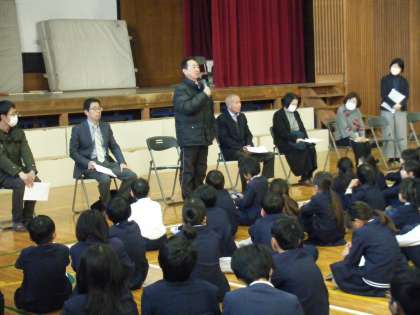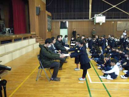 終業式の前に、見守り隊の方々に感謝を伝える会を行いました。1年生から感謝のメッセージと、プレゼントが送られました。そのあと、来ていただいた一人ひとりに、登下校で気を付けてほしいことや、子どもたちへの思いを伝えていただきました。3学期も子どもたちの登下校の見守りをどうぞよろしくお願いいたします。