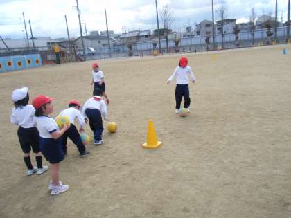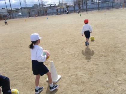 低学年は、体育の時間にサッカーの練習をしています。今日はドリブルの練習をしました。ドリブルをしながら向こう側に置いてあるコーンを回って戻ってきます。思い通りに進まないボールを笑いながら追いかけている1年生たちでした♪