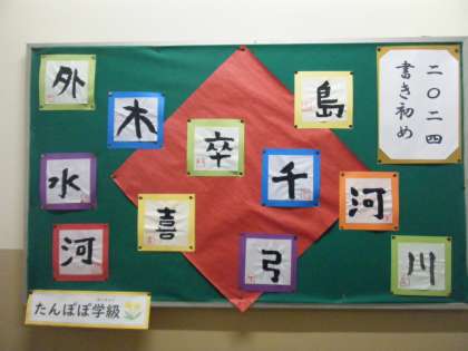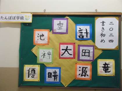 たんぽぽ学級の人たちの書き初めが、掲示されています。一文字入魂できました!