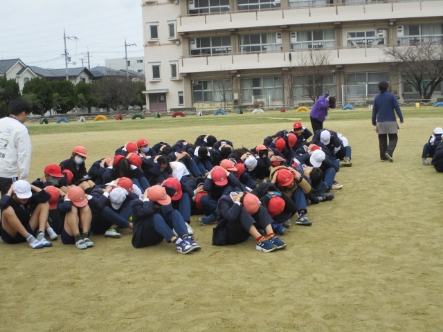 そのあとは運動場に集合。多くの人が運動場で遊んでいたので、3分以内に全員集合できました。