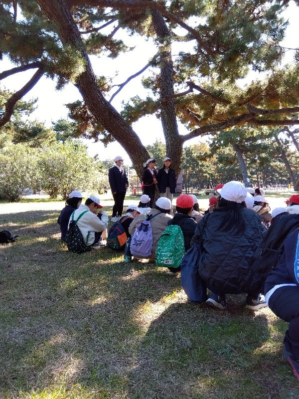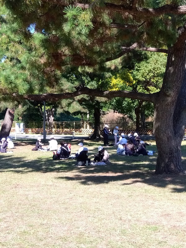 浜寺公園に着きお弁当タイムです。食事係のいただきますのあと、広い芝生で食べています。早朝よりお弁当の用意ありがとうございました。