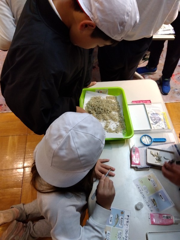 岸和田自然資料館で様々な動物のはく製や標本などを見て触れて観覧しました。ちりめんモンスター体験ではちりめんの中から魚、エビ、イカ、タコ、その他に分類しカードに貼り付けました。お土産で持ち帰ります。