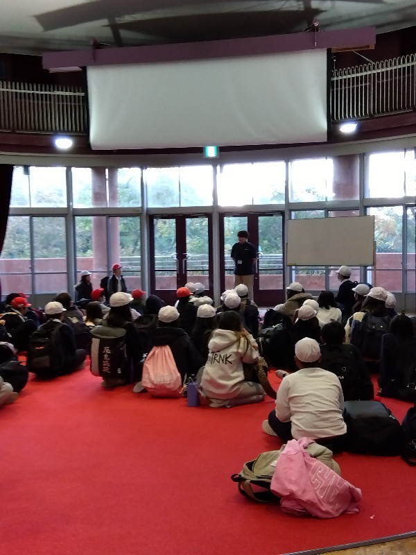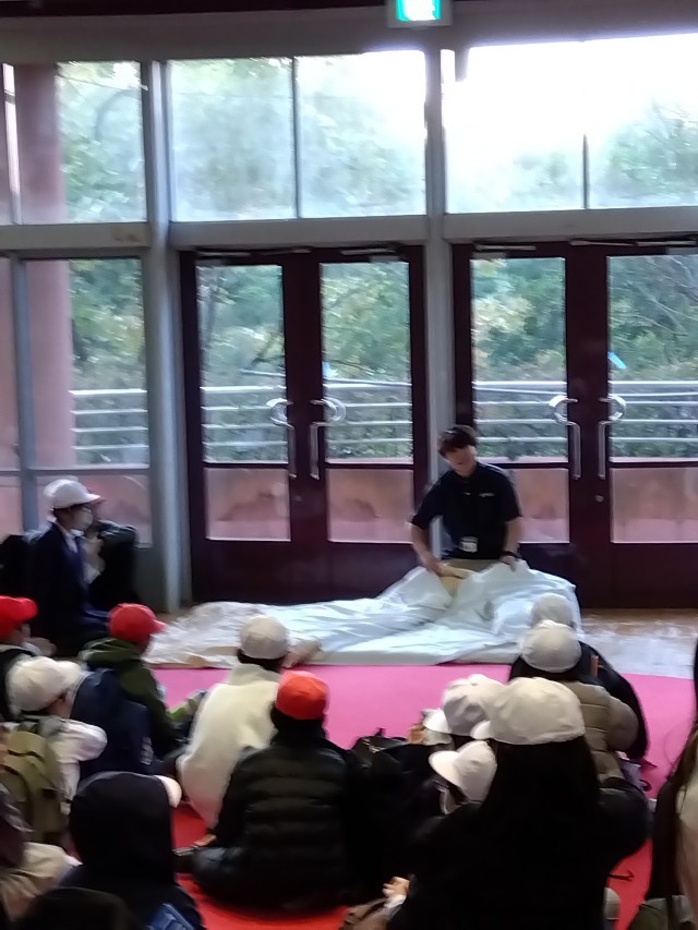 大阪府立青少年自然の家に到着し入所式をしています。施設の使い方やシーツや毛布のたたみ方など教わっています。みんな真剣に聞いています。