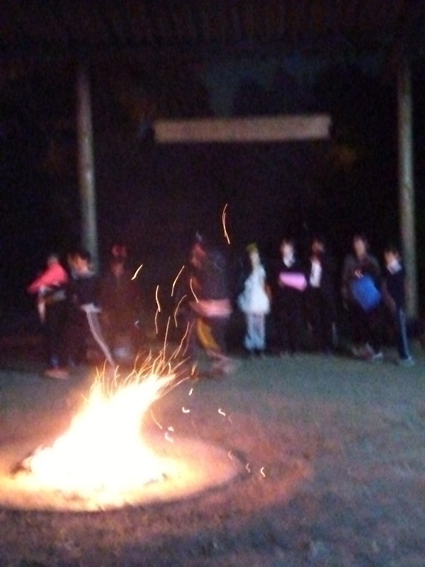 宿舎でボリュームたっぷりの夕食後はキャンプファイアーで大盛り上がりです。火の火の神様からありがたいお言葉をいただきました。コントやクイズ、劇、合唱など盛りだくさんです。