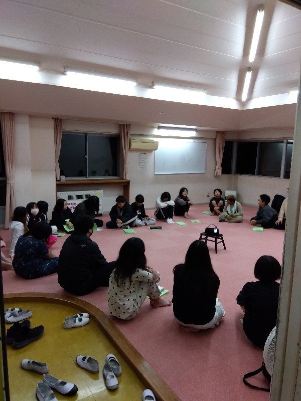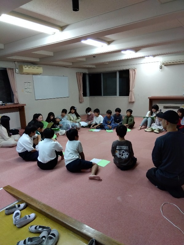 お風呂でさっぱりしたあとはクラスごとに集まり一日の振り返りをしました。助け合えたことやさりげない優しさなど一人ひとりが感じたことを伝えました。みんなケガもなく元気に過ごしています。