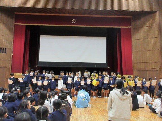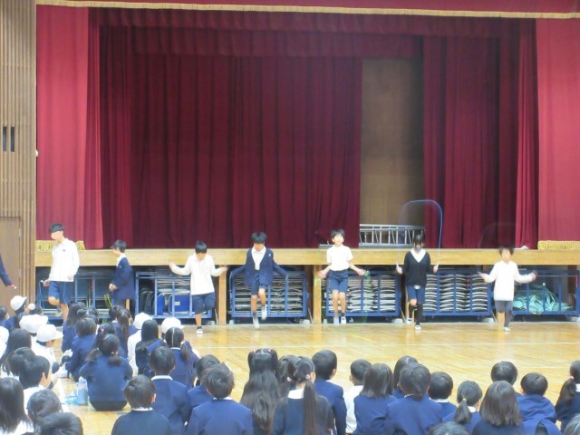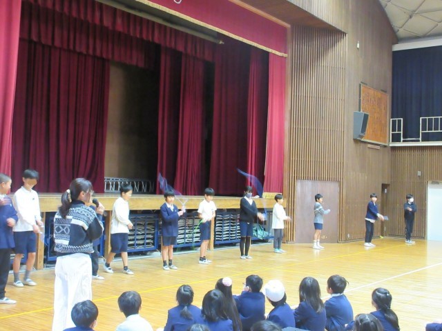 明日から「なわとびタイム」が始まります。20分休憩に音楽に合わせてなわとびをしたり、きょうだい学年で長縄をしたりします。今日の朝会では、運動委員の人たちが、いろんな技の見本を見せてくれました。「あやとび」「交差とび」「二重とび」「はやぶさとび」など…。寒くなりましたが、楽しく体力づくりをしてもらいたいと思います。