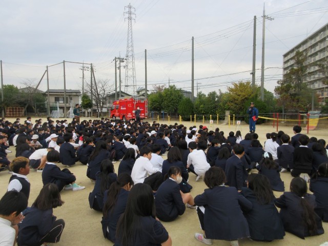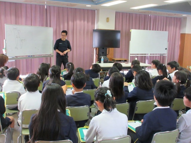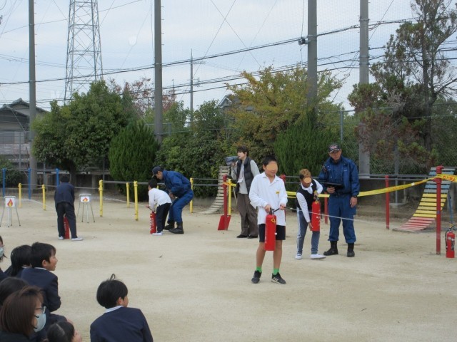 今日の2時間目に、火災避難訓練をしました。もしも学校で火災が起きて避難しなければならないときには、「お(押さない)は(走らない)し(しゃべらない)も(もどらない)」の約束を守るよう確認しました。また、消防士の方からは「マッチやライターで遊ばない」ことや「お家の人がいないときには、ガスコンロをさわらない」ことなどのお話をしてもらいました。消火器の使い方も教えていただき、代表の児童が実際に使う(水の消火器)体験もさせてもらいました。火事のニュースが増えています。ご家庭でも、避難経路や逃げる際に気を付けることなど、改めてお話をしていただけたらと思います。