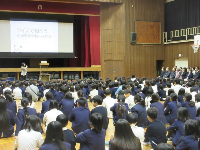東小は、今年度50周年を迎えました。そこで、昨日の朝、50周年を記念して全校集会を行いました。司会は6年生の代表委員の人たちです。各学年からは、地域の方たちに感謝の気持ちを込めて歌や発表を披露しました。そして、日ごろお世話になっている方々に、代表委員の人たちから感謝状と記念品を贈らせていただきました。これまでも今も、たくさんの方々に見守られて、東小が安心安全な学校になっていることを、改めて感じています。地域、保護者のみなさま、今後もどうぞよろしくお願いします。