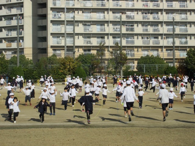 先週、先々週の20分休憩の時間は、なわとびタイムでした。運動委員の人の見本と音楽に合わせて、一人ひとりがいろんなとびかたで跳んだり、きょうだい学年のきょうだいクラスごとに大繩をしたりしました。風も強く、寒い日でしたが…仲良く大繩ができてみんな笑顔でした。