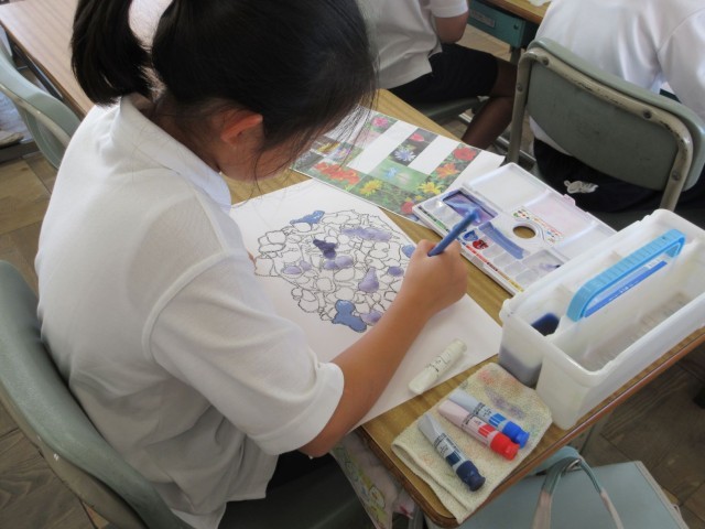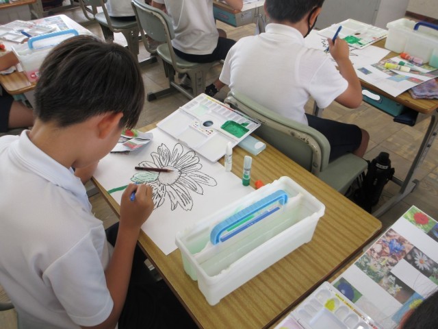 4年生は、図工で「ひとつの花をかこう」に取組んでいました。一人ひとりが写真などを見ながら、自分だけの「ひとつの花」に色をつけています。とってもよく集中して色を塗っていました。