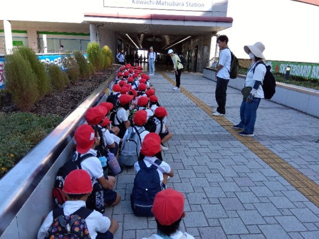 河内松原駅に着きました。電車での約束を確認しています。万博へはバスで行ったので、入学して初めての電車での遠足。