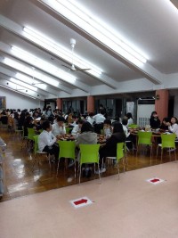 お風呂でさっぱりしたあとはクラスごとに集まり一日の振り返りをしました。助け合えたことやさりげない優しさなど一人ひとりが感じたことを伝えました。みんなケガもなく元気に過ごしています。