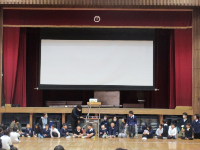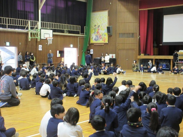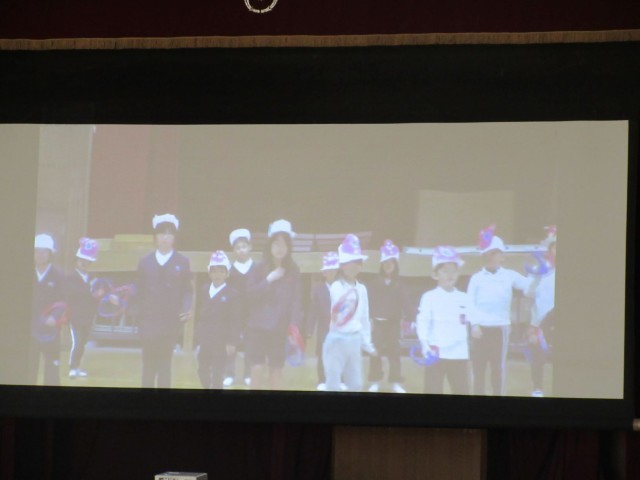 今日のガッツだ集会で、ひまわり学級の子どもたちが発表をしてくれました。発表形式は、事前に録画したものをスクリーンに映す形です。画用紙で作った帽子をかぶり、曲に合わせてダンスをする姿は、とっても素敵でした。ダンスを見た子どもたちからは、「みんな笑顔で踊っていて、自分たちも元気になった」「見ていて楽しかった」と感想を返しました。