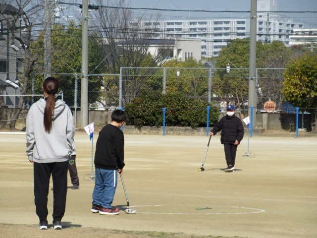 途中から日差しも出てきたので、外でのグランドゴルフも楽しめました。強く当てすぎると遠くに飛んでしまいますが、コツをつかむと上手にコントロールできるようになっていました。