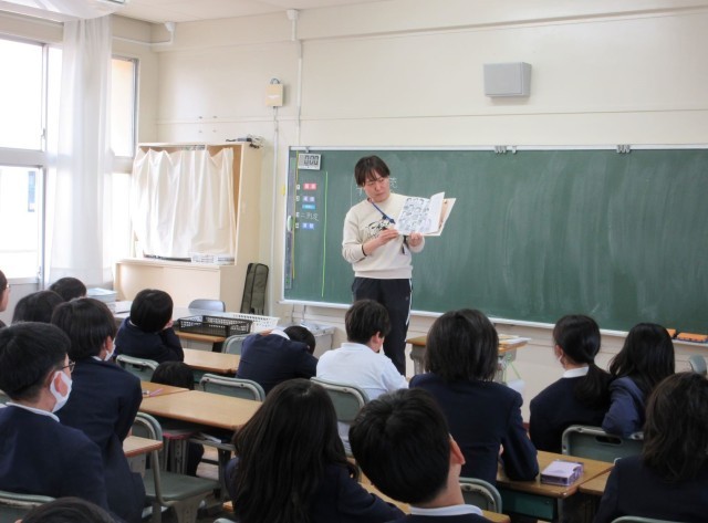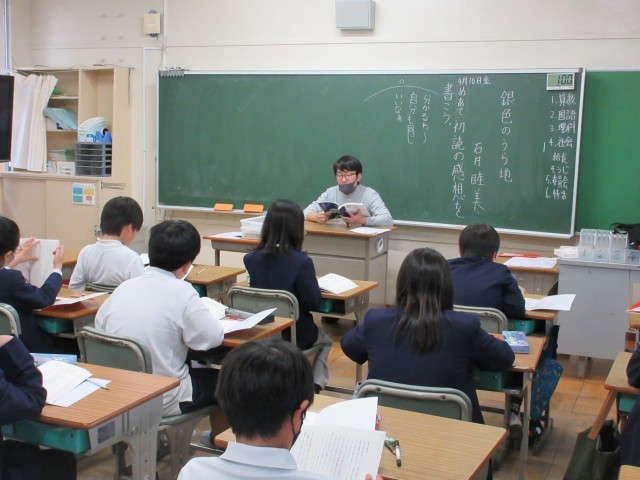 1組が国語の物語文の勉強をしているところ、2組が先生に「教室はまちがうところだ」の絵本を読んでもらっているところです。みんな、落ち着いた様子で授業を受けています。