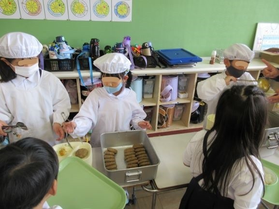 今日から1年生も給食スタートです。小学校で初めての給食当番…とても上手にごはんやおかずをよそっていました。カレーとハンバーグ、おいしかったかな。