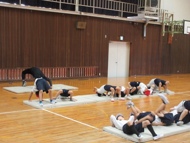 1年生が、体育館でマット運動をしていました。マットの上で「猫のあくび~」と言いながら、体を起こしていったり…ブリッジをしたり…腰を持って足を持ち上げたり…。難しそうな動きに次々と挑戦していました。技は難しそうでしたが、「気持ちいい~」と言いながら、とても楽しそうな様子。入学してから2週間。だいぶ学校に慣れてきたようです。