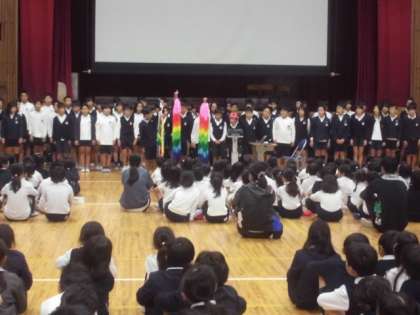 今日の全校朝会で、6年生修学旅行の出発式があり、全校児童に協力をお願いして完成した「折り鶴」の紹介がありました。