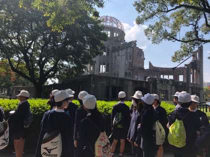 原爆ドームに到着です。ドームの見てきた歴史を感じて 子どもたちは、建物をじっと見上げています。