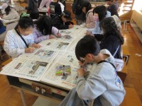 慰霊祭を終えて、平和記念公園の中を移動して、お弁当の時間です。資料館の前の木陰でみんな揃っての昼食です。ふと見ると、子どもたちがお弁当を食べている木陰は、被爆したアオギリの樹の木陰でした。