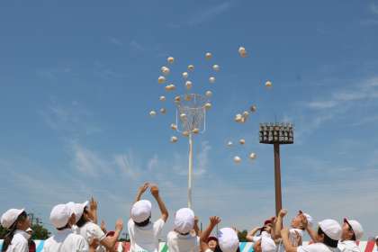 玉入れが始まりました。「イッセーの!」のかけ声で、みんなで一斉に玉を投げ入れます。2回とも、1分と少しで、全ての玉を入れることができました。