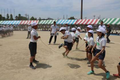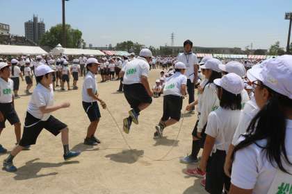 長縄跳びのスタートです。一列になってテンポよく縄を跳んでいきます。両方のクラスとも、最後まであきらめずに、200回近く縄を跳ぶことができました。よくがんばった!
