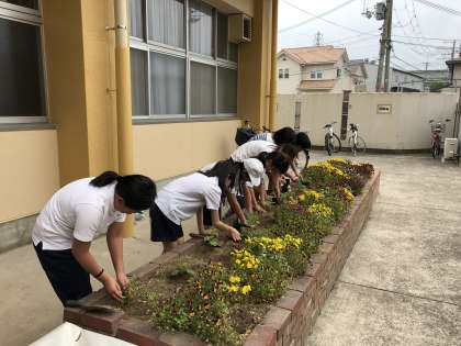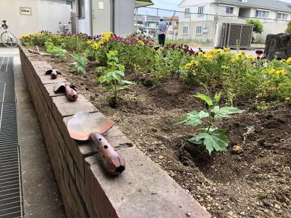 朝の時間帯に、正門を入ってすぐの花壇で園芸委員の子どもたちが活動をしてくれています。よく見ると、植えてくれていたのはゴーヤの苗でした。保健室への日差しを少しでも和らげることができるようにと、子どもたちは丁寧に植えてくれました。