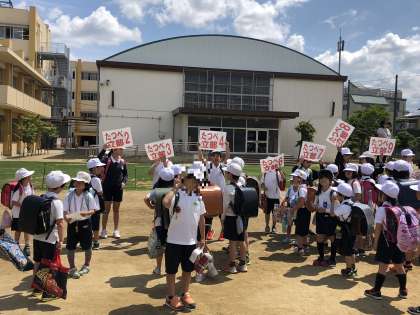 5月15日(水) 地区ごとに一緒に下校する「集団下校訓練」をおこないました。高学年が、地区ごとのプラカードを掲げて、自分の地区の下級生を並べてくれます。そろった地区から腰を下ろして、全部の地区がそろうのを待ってくれます。災害や大きな事故などがあったときに、同じ地区に住んでいる高学年が、低学年を守ることができるよう「縦の関係」をつないでくれています。