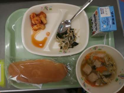 今日の献立は、コッペパン(メープル&マーガリン)シーフードのチリソース、ちゅうかに、ナムル、牛乳です。