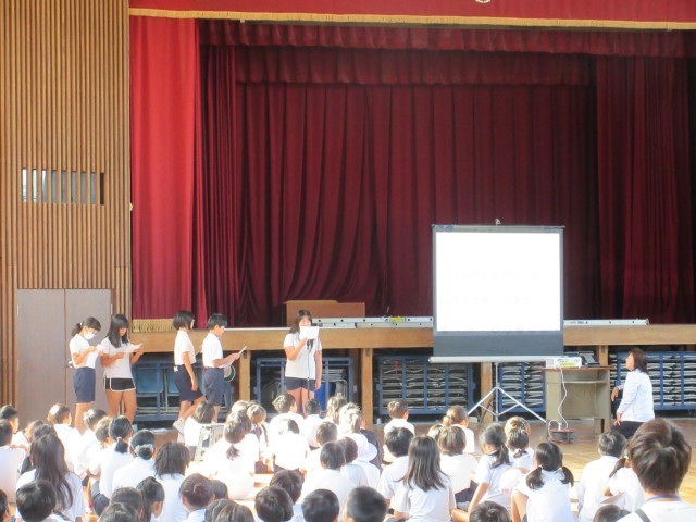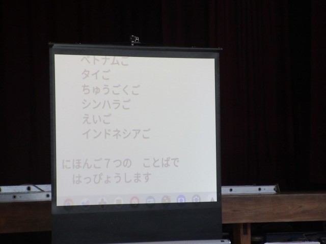 今日の全校朝会で、「運動会国際多言語放送実行委員会」の人たちが発表をしてくれました。今年の運動会で30回目(30年目)となる多言語でのプログラム案内について、「なんのためにしているのでしょう?」とみんなに投げかけ、答えを教えてくれました。〇国際教室で学ぶ友だちの、お家の人の言葉を覚えて、みんなに世界の言葉を楽しんでもらうため。〇国際教室で学ぶ外国から来た友だちや、お家の人に喜んでもらうため。〇外国から来た人にやさしい学校になるため…。当日は、日本語でプログラム案内をしたあと、多言語でのプログラム案内をします。子どもたちは、毎日一生懸命練習をしています。本番では、子どもたちに温かい応援をよろしくお願いします。