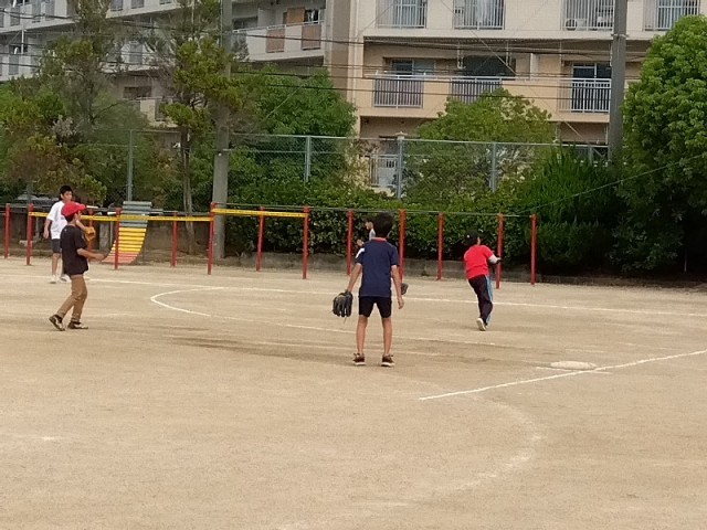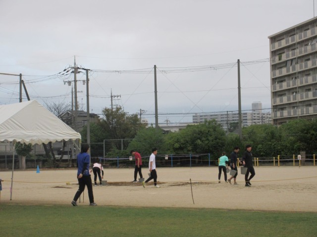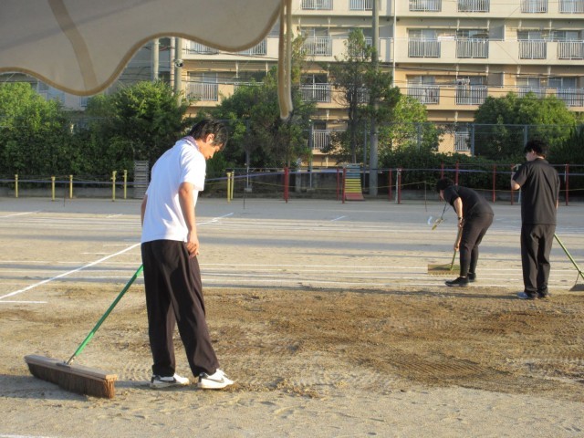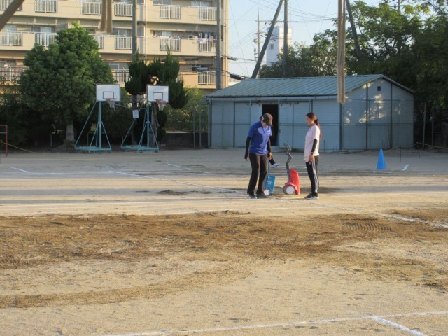 運動会、予定どおり実施します。朝から、教職員が運動場の整地とライン引きをして準備をしています。