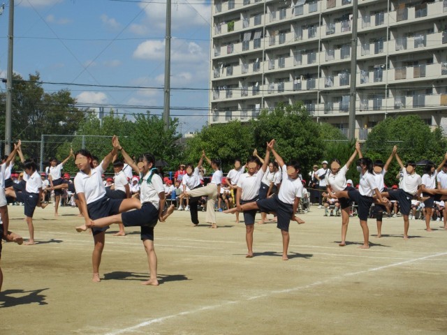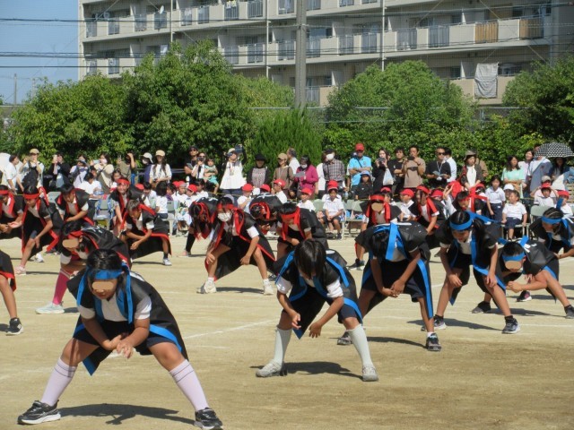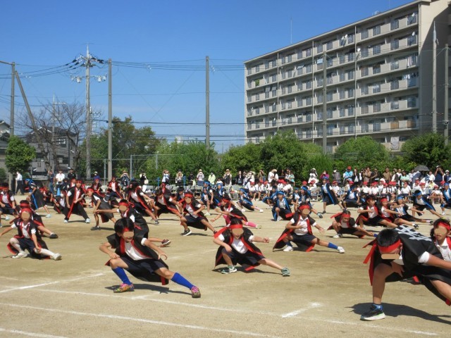 3・4年生の団体演技は「東小ソーラン」です。腰を低くして「どっこいしょー、どっこいしょ。ソーラン、ソーラン」と元気な声が揃います。黒いはっぴも決まっています。