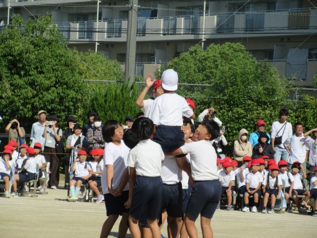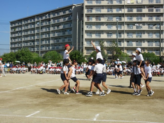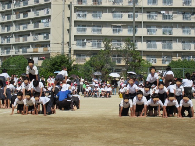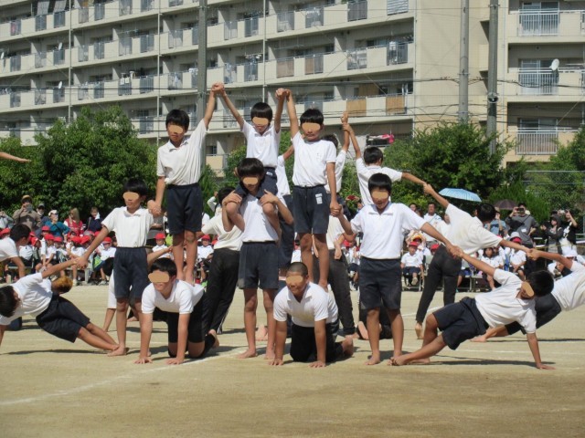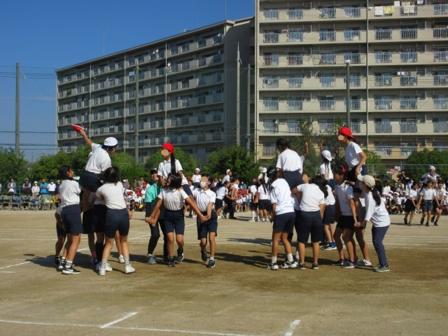 5・6年生の団体演技は「組立てがんばる界隈・TKG(たのしもう、きょうりょくしよう、がんばろう)!」です。始めは、土台がグラグラしたり上に乗って手を開くのが怖かったり…。毎日声をかけ合いながら練習を重ね、今日の日を迎えることができました。6年生は、小学校生活最後の運動会。やりきりました!