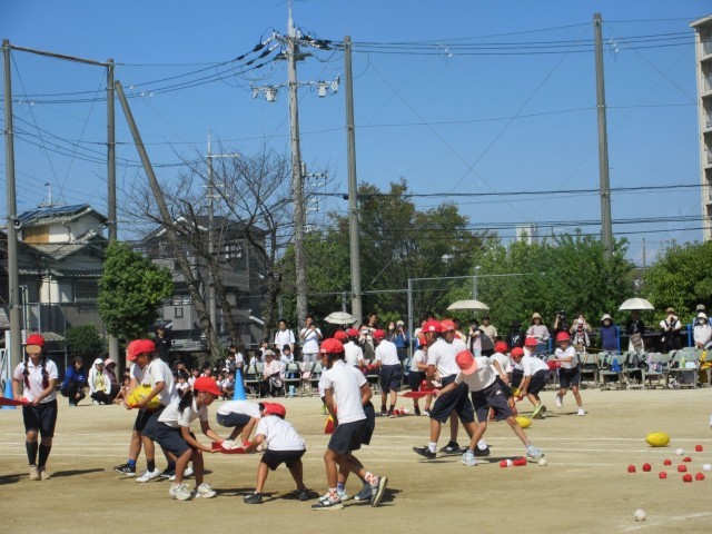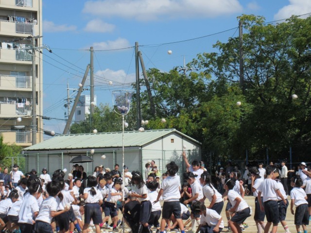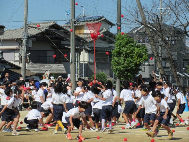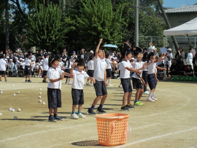 1・2年生の団体競技は「玉入れだけじゃだめですか?」です。楽しそうに踊りながら登場し、競技が始まると勢いよく玉を投げていました。