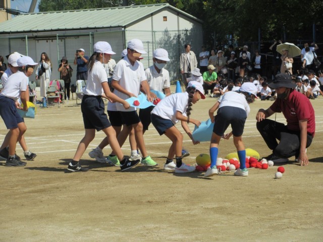3・4年生の団体競技は「みんなで運ぼう!!」です。色ごとの紙に玉入れの玉やボールを上手に乗せて運びます。早くたくさん運んだチームの勝ち!