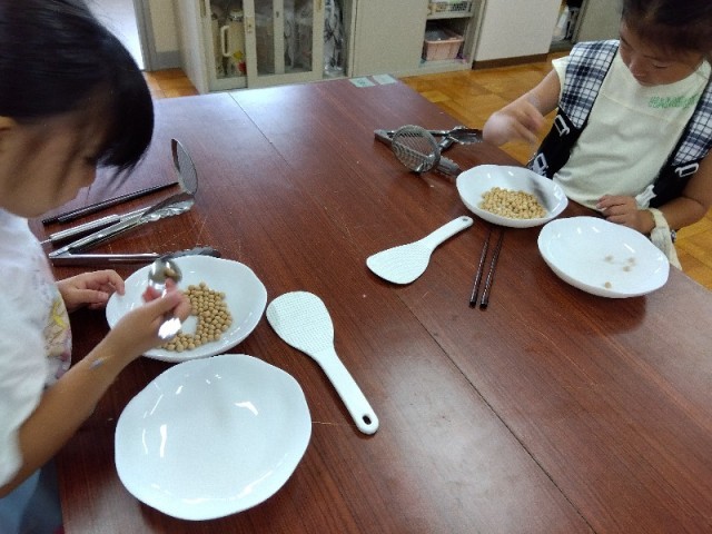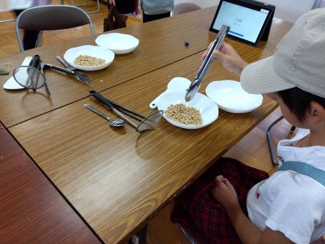 30秒間でいくつ豆をつかんで隣の皿へ運べるか。競い合っています。