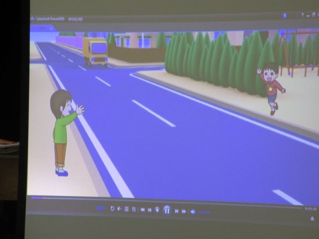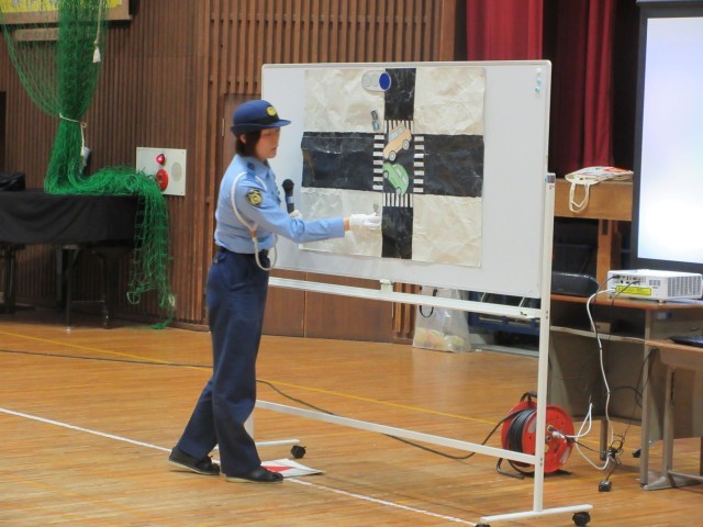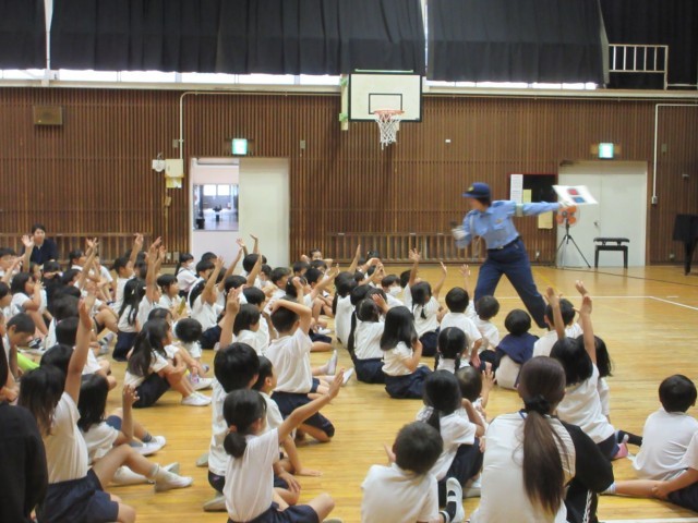 3時間目に、1・2年生が交通安全についてのお話を聞きました。松原警察から来てくださった警察官の方から、信号を守ることや横断歩道のわたり方などのお話を聞いた後、DVDをみました。道路をわたるときには「とまる」「みる」「まつ」の3つを大切にしようと確認してもらいました。
